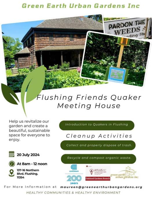 Flushing Meeting hosted an amazing community cleanup and beautification event at Flushing Meeting House on July 20, 2024, organized by Maureen Regan and Green Earth Urban Gardens, with more than 75 local youth, parents and members of the Alliance of Youth Leaders. For those of you who missed it, the event was covered by the Queens Chronicle: https://www.qchron.com/editions/north/cleanup-at-meeting-house/article_ddaca964-85f7-5497-85cb-061bda24c339.html?utm_medium=social&utm_source=email&utm_campaign=user-share. There are also more photos here: https://photos.app.goo.gl/grTsrcGpnNXtm8Vo7